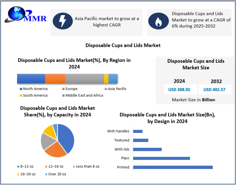 The Global Disposable Cups and Lids Market is witnessing steady expansion as convenience-driven consumption continues to rise worldwide. The market was valued at USD 308.92 billion in 2024 and is projected to reach USD 492.37 billion by 2032, growing at a CAGR of 6%.