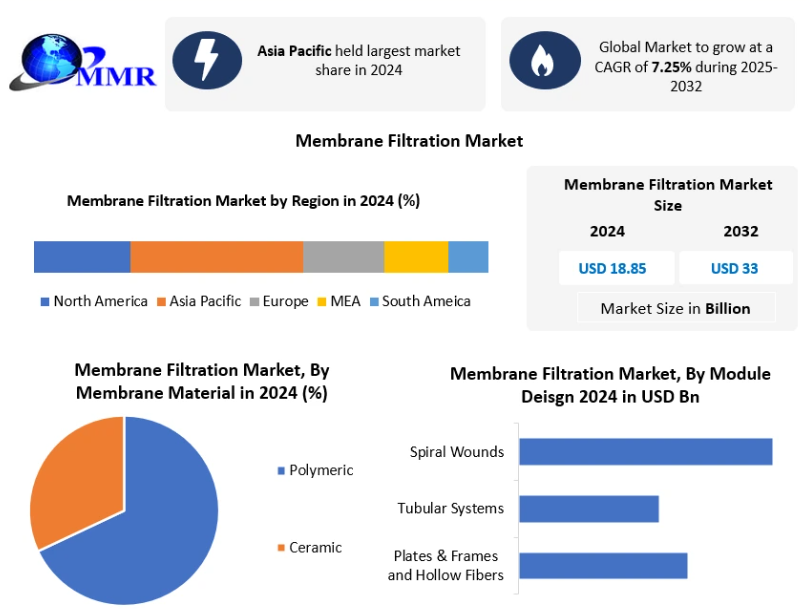 The global Membrane Filtration Market is experiencing significant momentum, driven by increasing demand for high-purity products, stringent environmental regulations, and rapid technological advancements. Valued at USD 18.85 billion in 2024, the market is projected to grow at a compound annual growth rate (CAGR) of 7.25% from 2025 to 2032, reaching nearly USD 33 billion by the end of the forecast period. This steady growth reflects the rising importance of advanced filtration technologies across industries such as water and wastewater treatment, food and beverage processing, pharmaceuticals, and biotechnology.