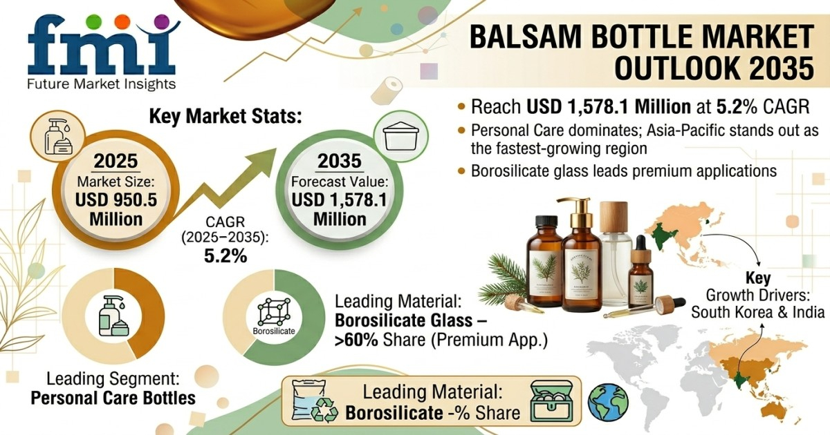The balsam bottle market is valued at USD 950.5 million in 2025 and is expected to reach USD 1,578.1 million by 2035, expanding at a CAGR of 5.2%. Borosilicate glass remains the leading material segment, accounting for over 60% of premium applications. Personal care continues to dominate end-use demand, while Asia Pacific stands out as the fastest-growing region, led by South Korea and India.