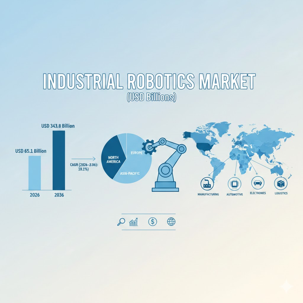 The global Industrial Robotics Market is projected to grow from USD 65.1 billion in 2026 to USD 343.8 billion by 2036, expanding at a CAGR of 18.1%, according to Future Market Insights (FMI). The surge reflects a structural transformation in manufacturing, where automation, artificial intelligence (AI), and smart factory investments are becoming essential rather than optional.