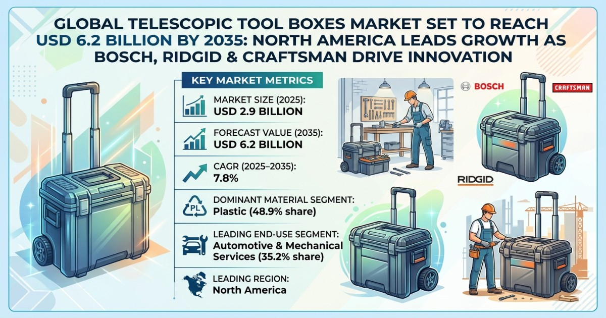The global telescopic tool boxes market is witnessing robust expansion, projected to grow from USD 2.9 billion in 2025 to USD 6.2 billion by 2035, registering a CAGR of 7.8% during the forecast period. This steady growth is fueled by rising demand for portable, space-efficient, and organized tool storage solutions across industries such as construction, automotive, and manufacturing.