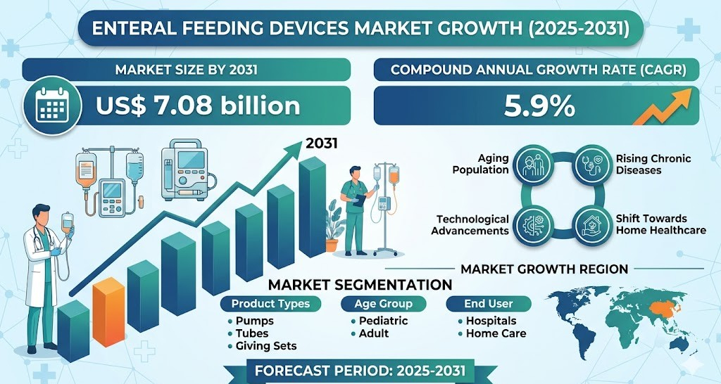 The Enteral Feeding Devices Market Scope highlights a strong growth trajectory, with the industry projected to reach US$ 7.08 billion by 2031, expanding at a CAGR of 5.9% during the forecast period. Growth is supported by rising incidences of chronic illnesses, advancements in device technology, and the growing need for cost-effective nutritional solutions across diverse patient populations.