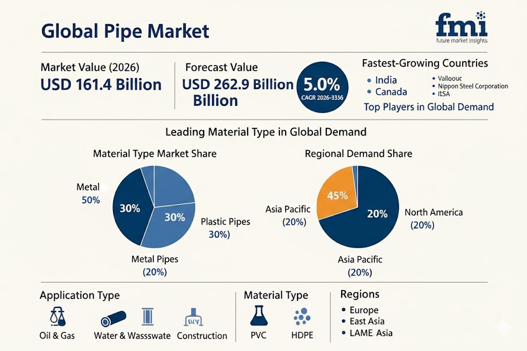 The global Pipe Market is entering a decade of structured and predictable expansion, supported by essential infrastructure development rather than short-term construction cycles. Valued at USD 161.4 billion in 2026, the market is projected to reach USD 262.9 billion by 2036, registering a CAGR of 5.0%. This growth trajectory reflects sustained capital deployment toward water distribution systems, energy transport corridors, and industrial utility networks across both mature and emerging economies.