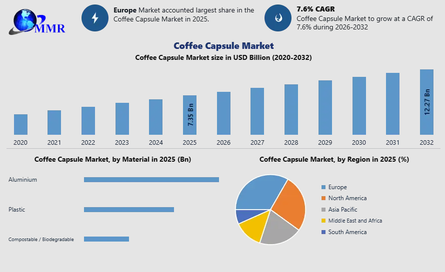 The global Coffee Capsule Market continues to witness robust expansion, driven by evolving consumer lifestyles, rising coffee consumption, and increasing demand for convenience-oriented products. Valued at USD 7.35 billion in 2025, the market is projected to grow at a CAGR of 7.6% from 2026 to 2032, reaching nearly USD 12.27 billion by 2032.