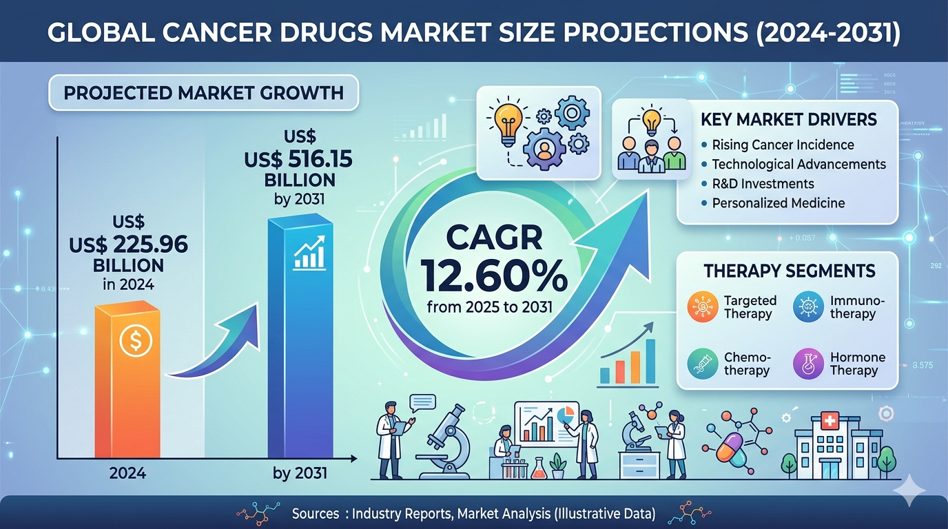 The cancer drugs market size is projected to reach US$ 516.15 billion by 2031 from US$ 225.96 billion in 2024. The market is expected to register a CAGR of 12.60% from 2025 to 2031. This strong growth reflects the expanding scope of oncology therapeutics, driven by technological advancements and increasing global cancer incidence. The continuous introduction of novel treatment options and supportive regulatory frameworks are further accelerating the expansion of the Cancer Drugs Market.