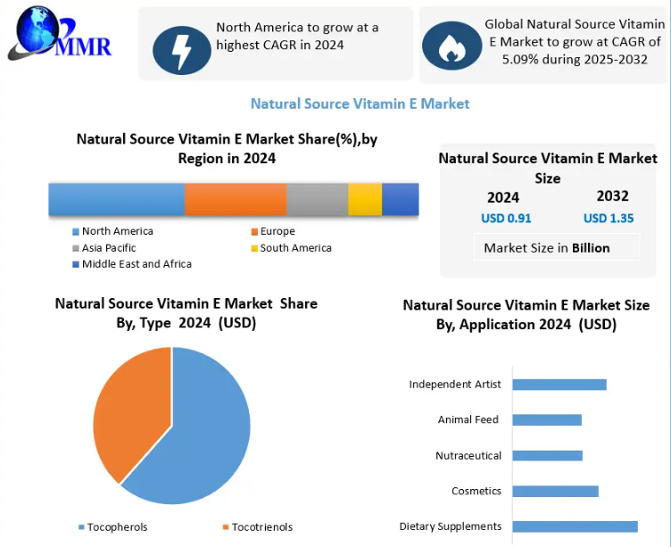 The Global Natural Source Vitamin E Market is witnessing steady expansion as consumer awareness of preventive healthcare, antioxidant-rich nutrition, and clean-label dietary ingredients continues to rise. Valued at USD 0.91 Billion in 2024, the market is projected to grow at a CAGR of 5.09% from 2025 to 2032, reaching nearly USD 1.35 Billion by 2032. Increasing demand across dietary supplements, functional foods, cosmetics, and animal nutrition is significantly shaping the market landscape worldwide.