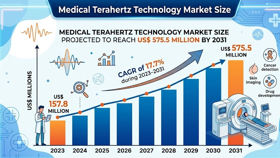 The Medical Terahertz Technology Market Overview indicates strong growth momentum, with the global sector projected to increase significantly from US$ 157.8 million in 2023 to US$ 575.5 million by 2031.This reflects a robust CAGR of 17.7% during the forecast period, driven by technological innovation, increasing cancer prevalence, and rising demand for non-invasive diagnostic solutions.