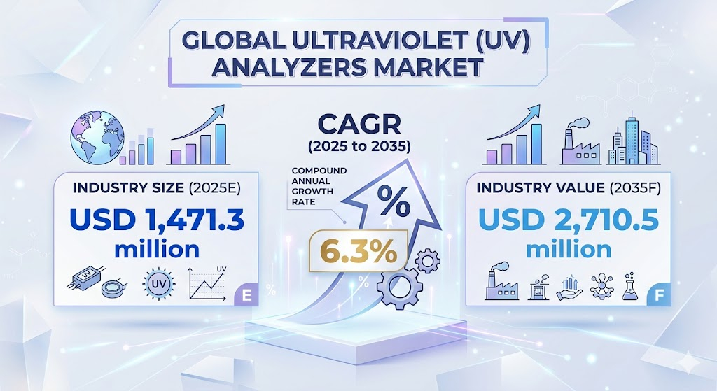the global ultraviolet (UV) analyzers market is entering a high-growth phase, driven by rising environmental concerns, regulatory mandates, and rapid technological advancements. Valued at USD 1,471.3 million in 2025, the market is projected to reach USD 2,710.5 million by 2035, expanding at a CAGR of 6.3% during the forecast period.