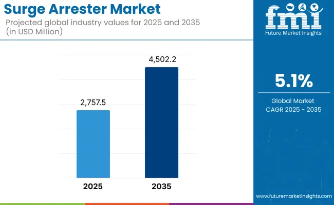 The global surge arrester market is valued at USD 2,757.5 million in 2025. - What is the projected market value by 2035?