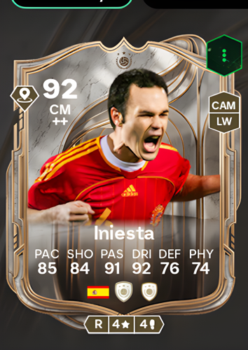 Иконная карта Андреса Иньесты Лухана выделяется как очень востребованный центральный полузащитник с впечатляющим общим рейтингом 92. С рейтингом скорости 85 и дриблингом 92, Иньеста предлагает исключительную ловкость и контроль мяча, позволяя ему легко обходить соперников в узких пространствах. Его атрибут передачи 91 обеспечивает точное распределение, делая его творческим сердцем любой полузащиты, в то время как его рейтинг удара 84 означает, что он более чем способен вносить решающие голы из глубины. Хотя его защита (76) и физическая сила (74) не являются его сильными сторонами, его техническое мастерство и видение делают эту карту изменяющей игру — идеальной для организации атак, поддержания владения и вскрытия обороны с легкостью, давая вам преимущество в критические моменты на поле.