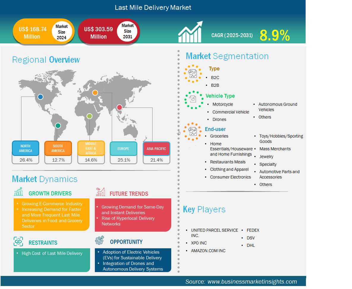 The Last Mile Delivery Market Analysis and Overview presents a large and rapidly expanding global market, valued at US$ 168,739.40 million in 2024 and projected to reach US$ 303,593.58 million by 2031, registering a CAGR of 8.9% during the forecast period from 2025 to 2031. This near-doubling of market value within seven years reflects the powerful structural forces reshaping global commerce, including the explosive growth of e-commerce creating unprecedented consumer demand for fast and reliable delivery, the rising consumer expectation for same-day and next-day delivery options transforming logistics operations, and the transformative integration of autonomous vehicles, drone delivery systems, electric fleets, and AI-driven route optimization technologies that are fundamentally redefining how goods travel from distribution centers to consumers across global markets.