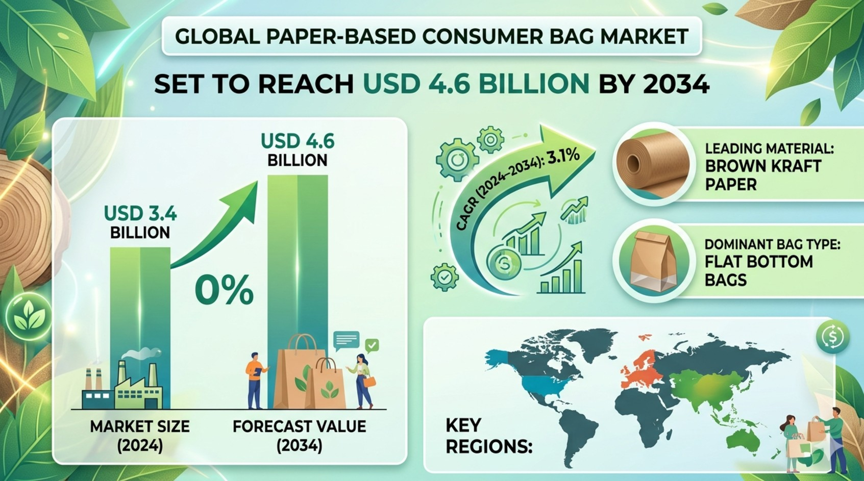 The global paper based consumer bag market is valued at USD 3.4 billion in 2024 and is projected to reach USD 4.6 billion by 2034, registering a CAGR of 3.1% during the forecast period. Growth is primarily driven by rising environmental concerns, regulatory bans on single-use plastics, and increasing consumer preference for sustainable packaging solutions.