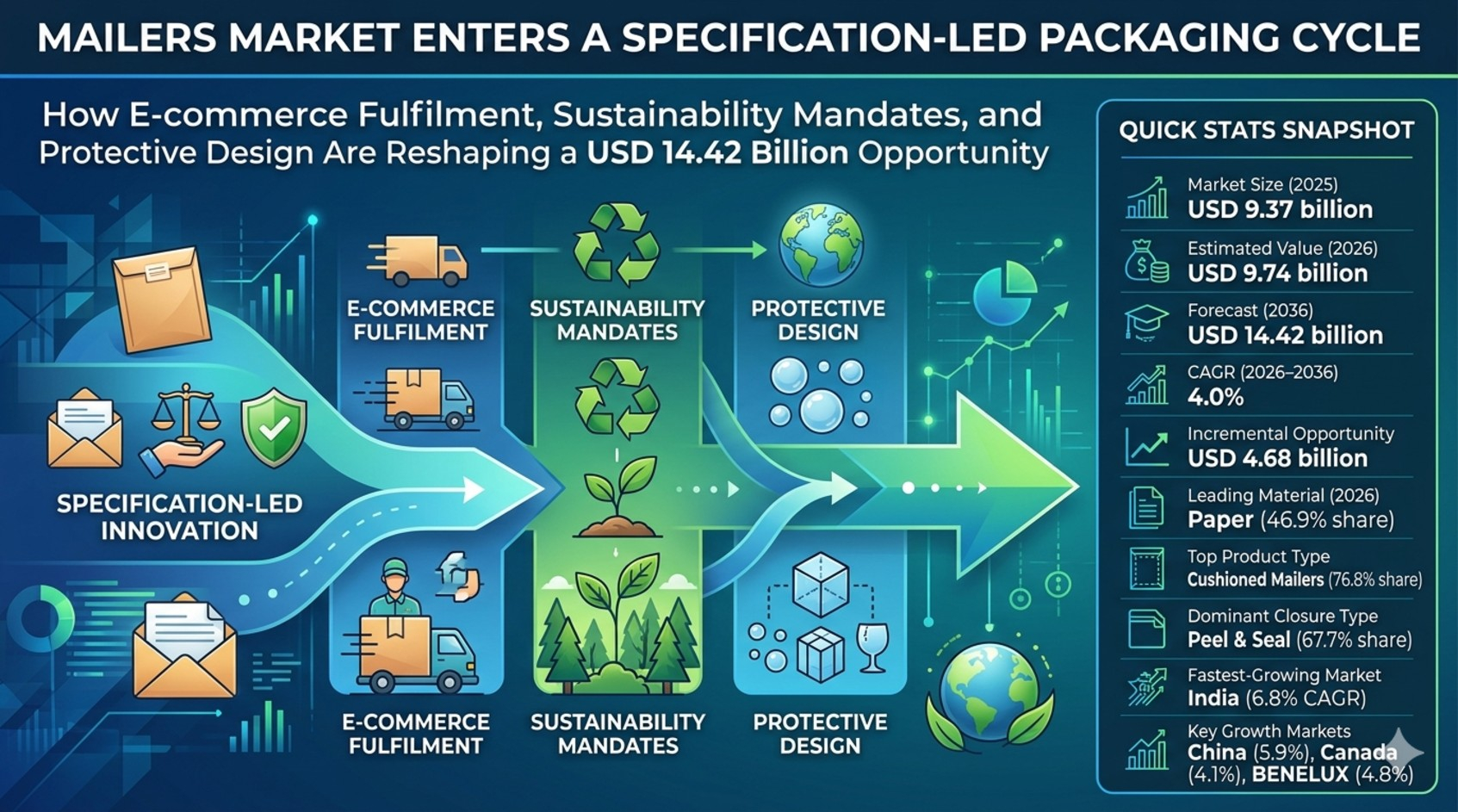 The global mailers market is undergoing a structural transition from volume-driven procurement to specification-led decision-making, where compliance, performance, and sustainability define competitive positioning. Once treated as a commoditized packaging format, mailers are now engineered solutions balancing protection, cost efficiency, and regulatory alignment. As e-commerce volumes scale and environmental mandates tighten across major economies, packaging buyers are re-evaluating material composition, cushioning performance, and recyclability elevating mailers into a strategic component of supply chain design.